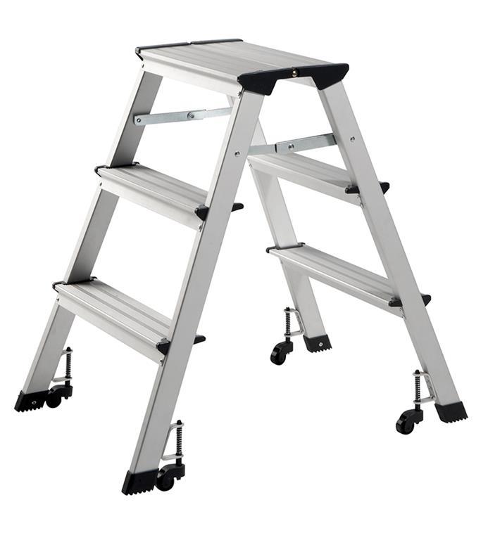 - ko stopite na lestev, se kolesa pomaknejo navzgor in lestev trdno stoji na tleh