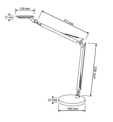 - premer podstavka 19 cm, dolžina spodnje roke 33,6 cm, zgornje roke 37,1 cm, premer svetilnega dela 12 cm