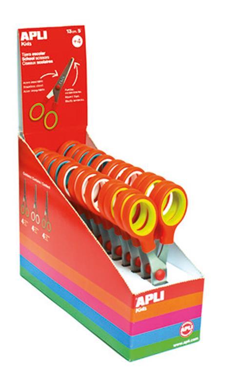 - displej šolskih škarij v različnih barvnih kombinacijah: rdeče/rumene, rdeče/bele in rdeče/modre