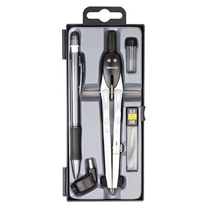 - šestilo iz cinkove litine s plastično glavo, dvema tipkama, osjo za natančno nastavitev in največjim premerom 340 mm