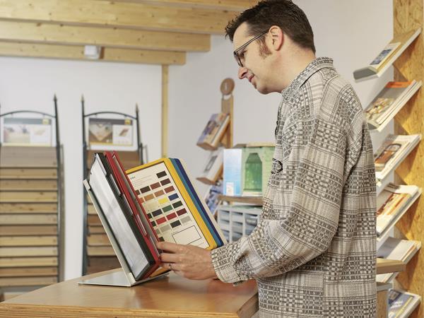 Celotni set, ki je sestavljen iz 30 predstavitvenih map velikosti A4 (5606) v šestih barvah s tabulatorji in kovinskega stojala.