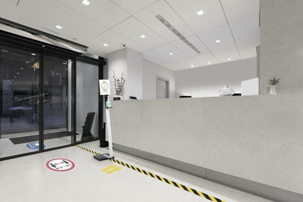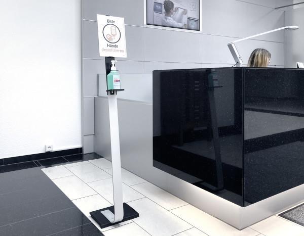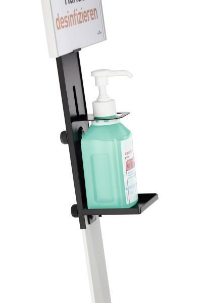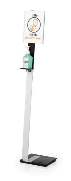 - trden, visokokakovosten dozirnik za dezinfekcijsko sredstvo kot premično samostoječe stojalo z aluminijasto informacijsko ploščo