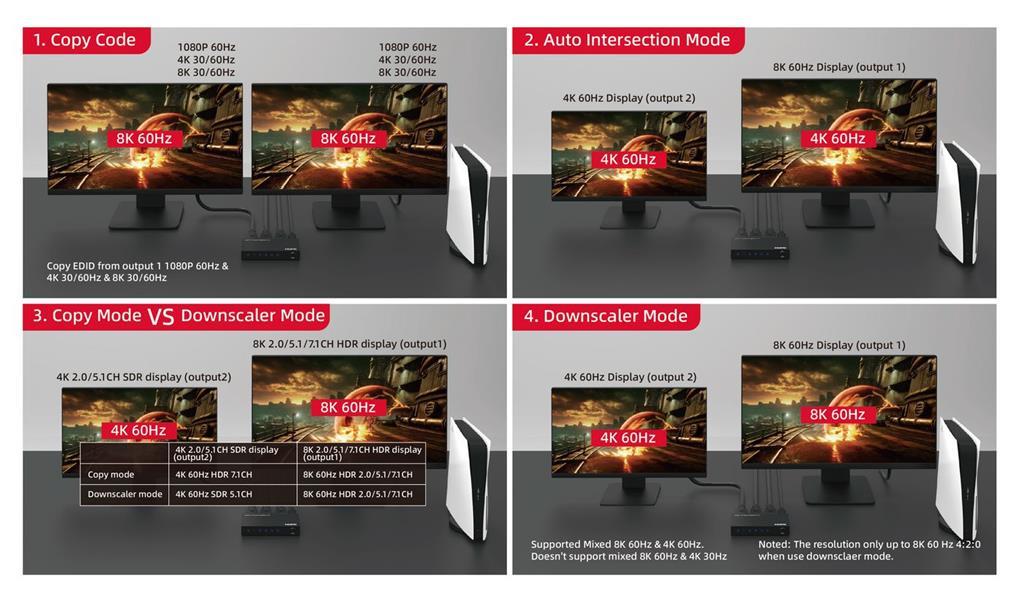 Ima tri inteligentna EDID načina rada (Auto, Copy i Downscaler), splitter se prilagođava različitim konfiguracijama zaslona, osiguravajući najbolju moguću razlučivost i audio format za oba povezana zaslona. Bilo da koristite 8K, 4K ili 1080p zaslone, pruža besprijekornu izvedbu, što ga čini idealnim za kućna kina, gejmerske postave, digitalne oglasne ploče i profesionalne AV primjene.