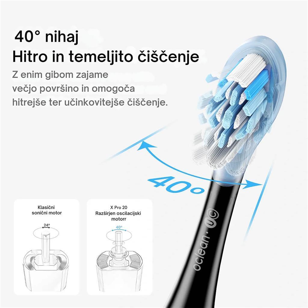 Oclean X Pro 20 združuje najsodobnejšo tehnologijo z lahkotno zabavo za osebno nego in ponuja popolno mešanico inovacij in zabave. V realnem času sledi 12 območjim ščetkanja, kar zagotavlja, da nobeno območje ne bo spregledano za resnično temeljito čiščenje. Poganja jo motor Oclean Maglev 4.0 s 40° super širokim nihanjem, ki zagotavlja zelo učinkovito odstranjevanje zobnih oblog za globlje in natančnejše čiščenje. X Pro 20 ponuja tudi prilagojene izkušnje ščetkanja z interaktivnimi funkcijami, ki vaši dnevni rutini dodajo kanček užitka.