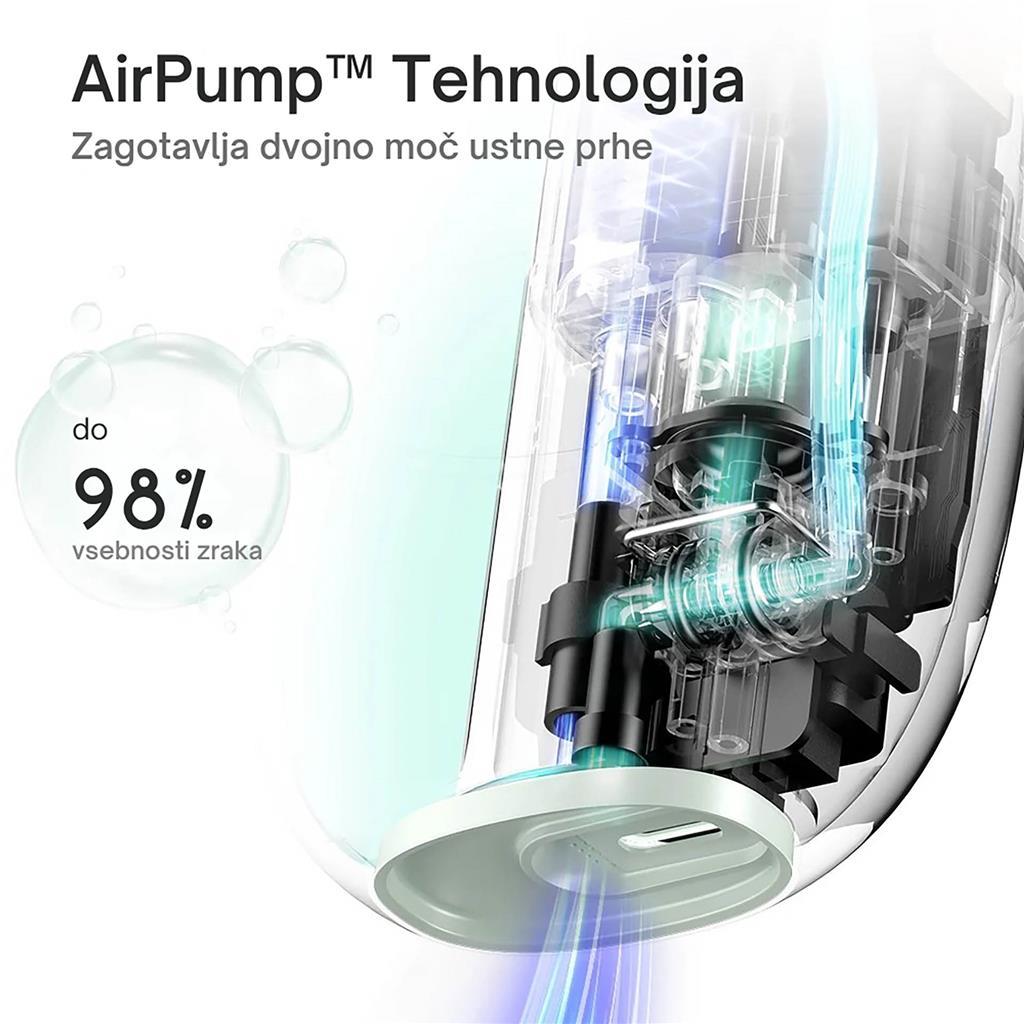 Tehnologija AirPump združuje zračni in vodni curek z do 98 % vsebnostjo zraka. S pulznim izpustom učinkovito in nežno odstrani ostanke hrane med zobmi ter prispeva k boljšemu zdravju ustne votline.