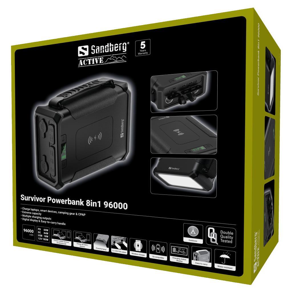 Prijenosna baterija Sandberg Survivor Powerbank 8in1 96000 je savršena punionica za praktično sve vaše uređaje. Ogroman kapacitet baterije od 96000 mAh dovoljan je da vaš pametni telefon punite gotovo svaki dan tijekom gotovo cijelog mjeseca.