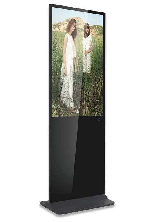 Samostoječ eleganten oglaševalski zaslon izjemno tankega dizajna. Izdelan iz jekla in varnostnega kaljenega stekla. Dostop do omarice z elektroniko zadaj.
