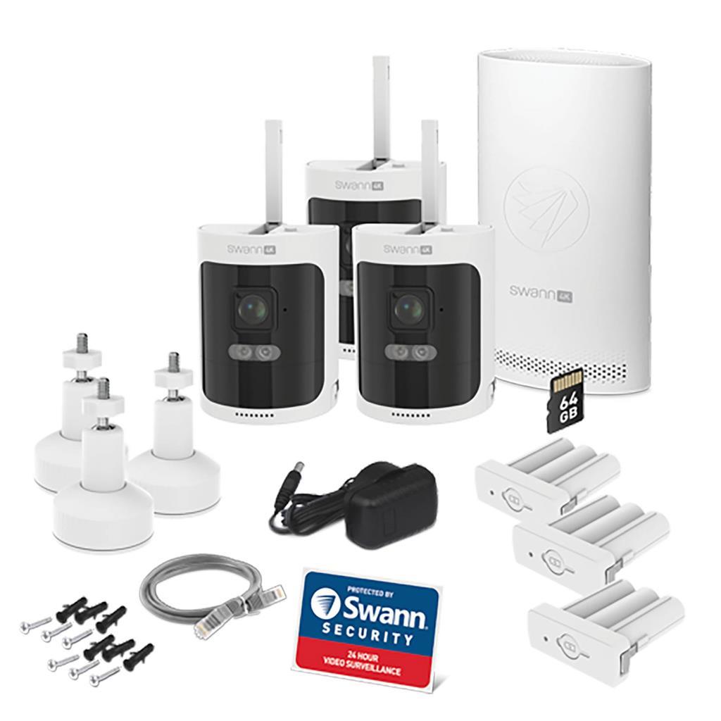 Swann AllSecure800 4K varnostni sistem – 3 Wi-Fi kamere z odstranljivo baterijo – 64GB SD NVR – polnilna postaja – nočni vid – notranja in zunanja uporaba – bela