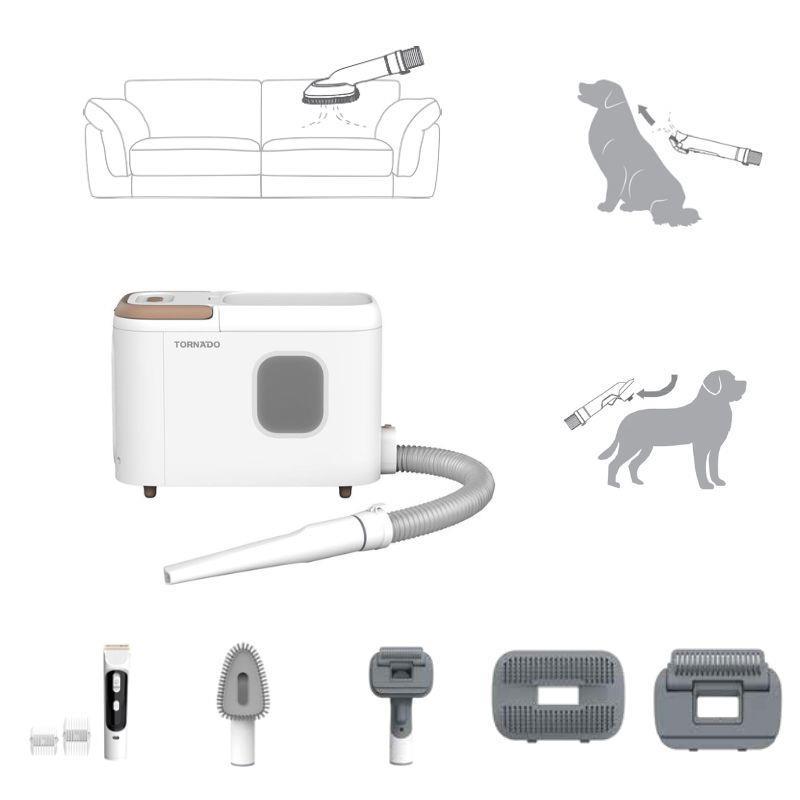 - Set za urejanje domačih živali: cev, strižnik za dlake, glavnik (3 nastavki), dolg nastavek in krtača za pospravljanje